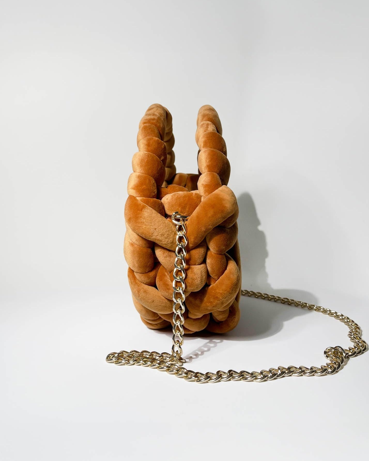Mala em forma circular, revestida manualmente por fios de veludo de 2,5 cm através da técnica de arm knit. O seu design escultural e o toque aveludado criam um impacto de força e elegância.